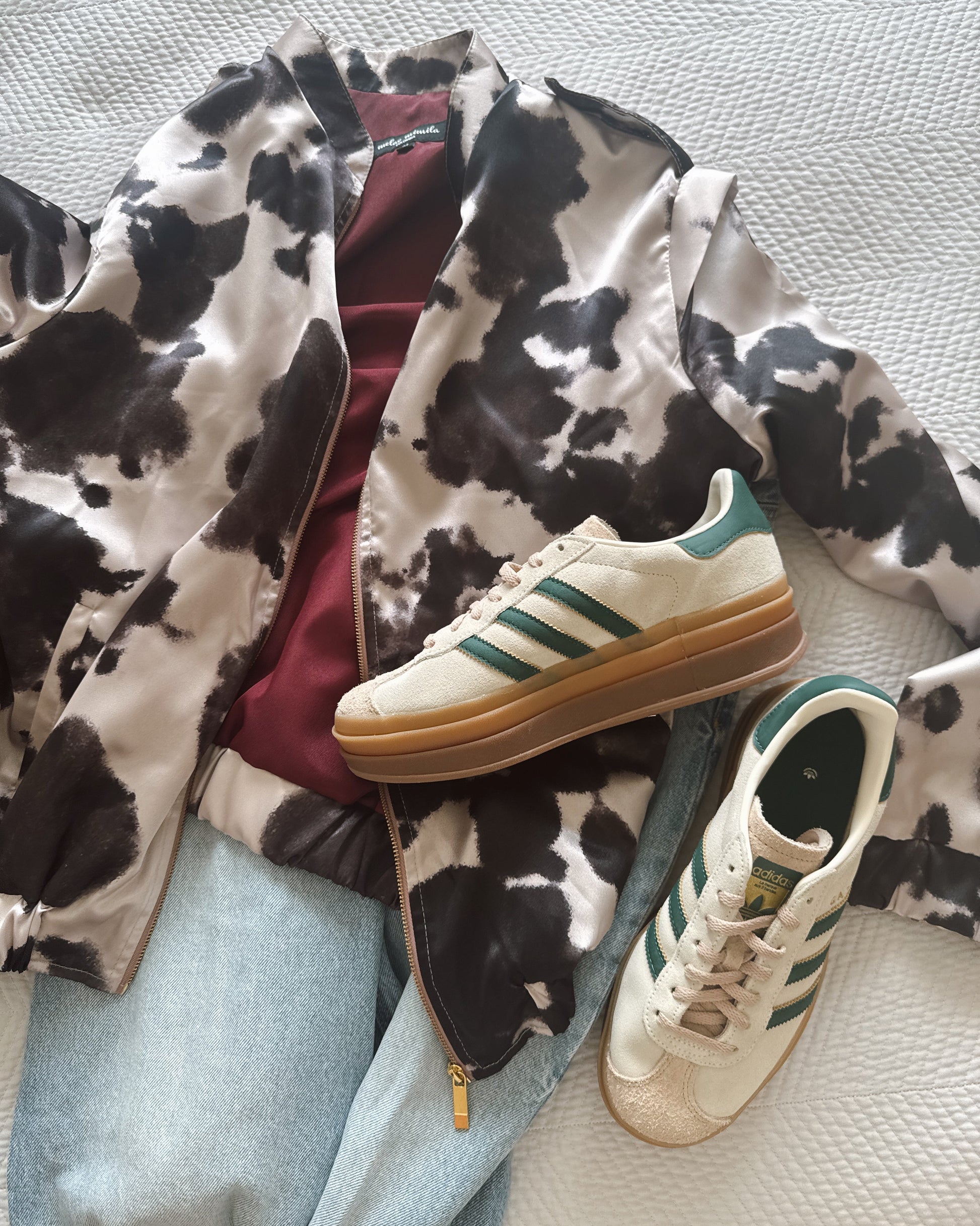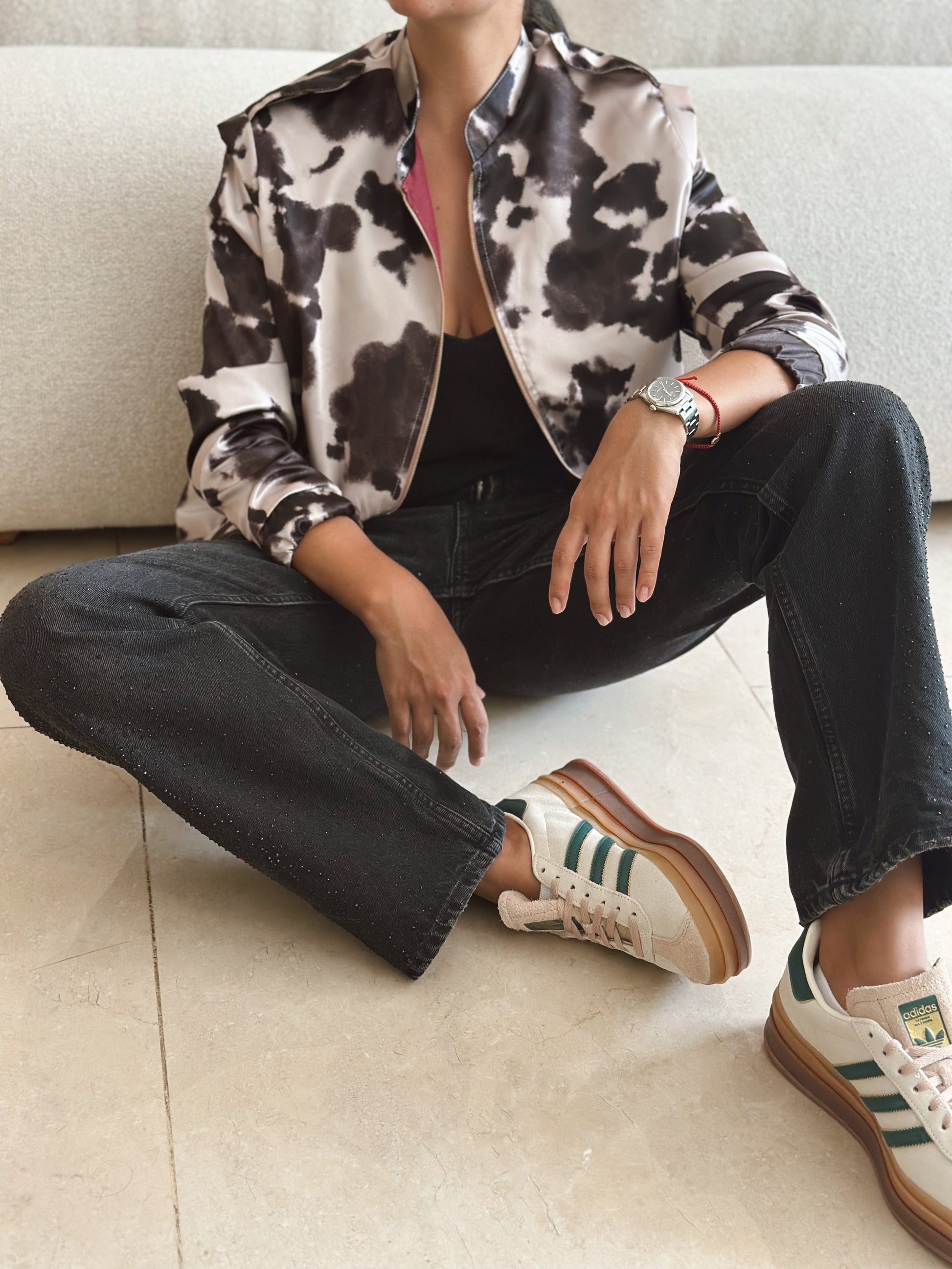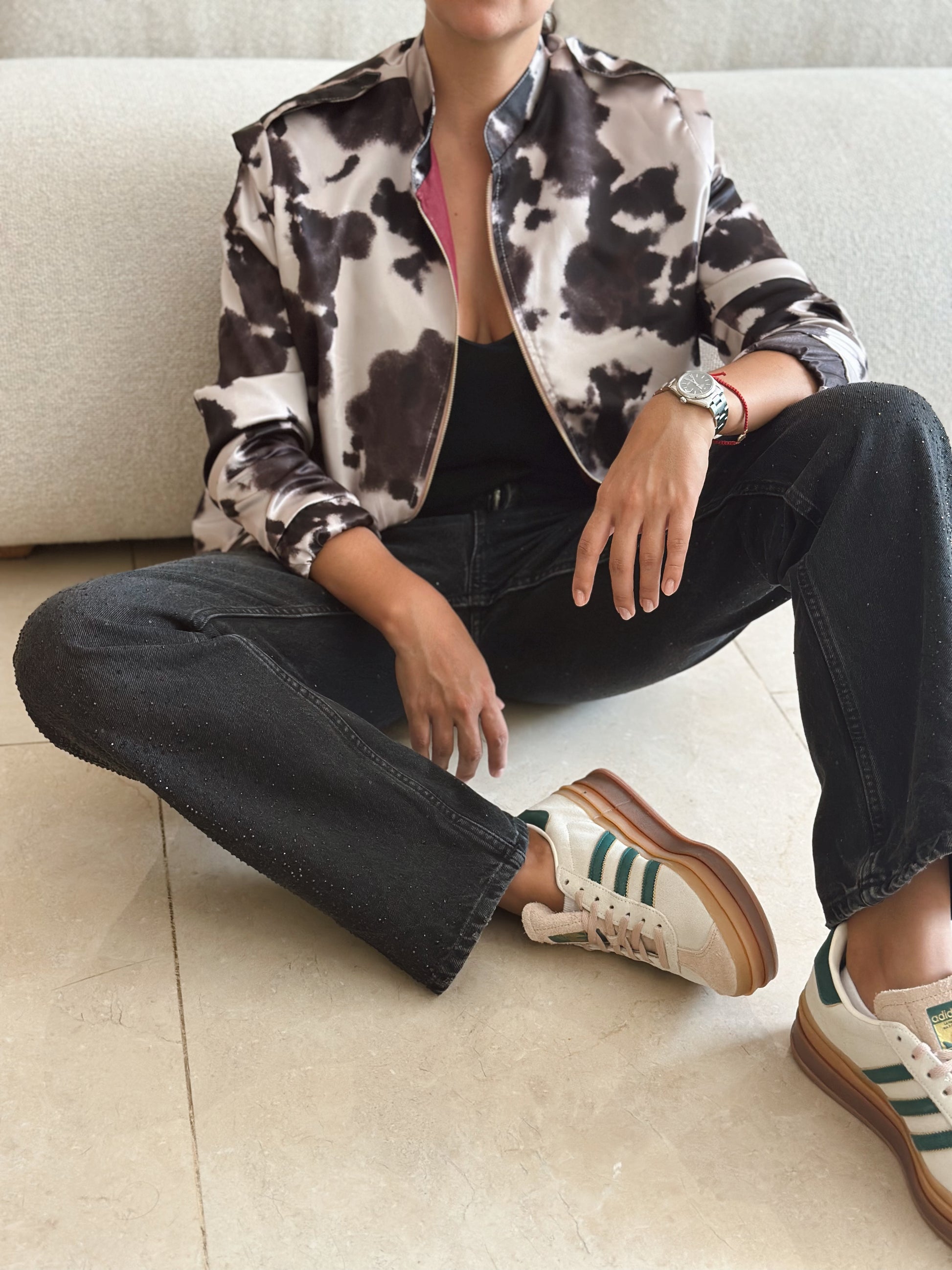 Rock Jacket liviana con estampado de vaca, forro vinotinto, cremallera metalica central y bolsillos laterales