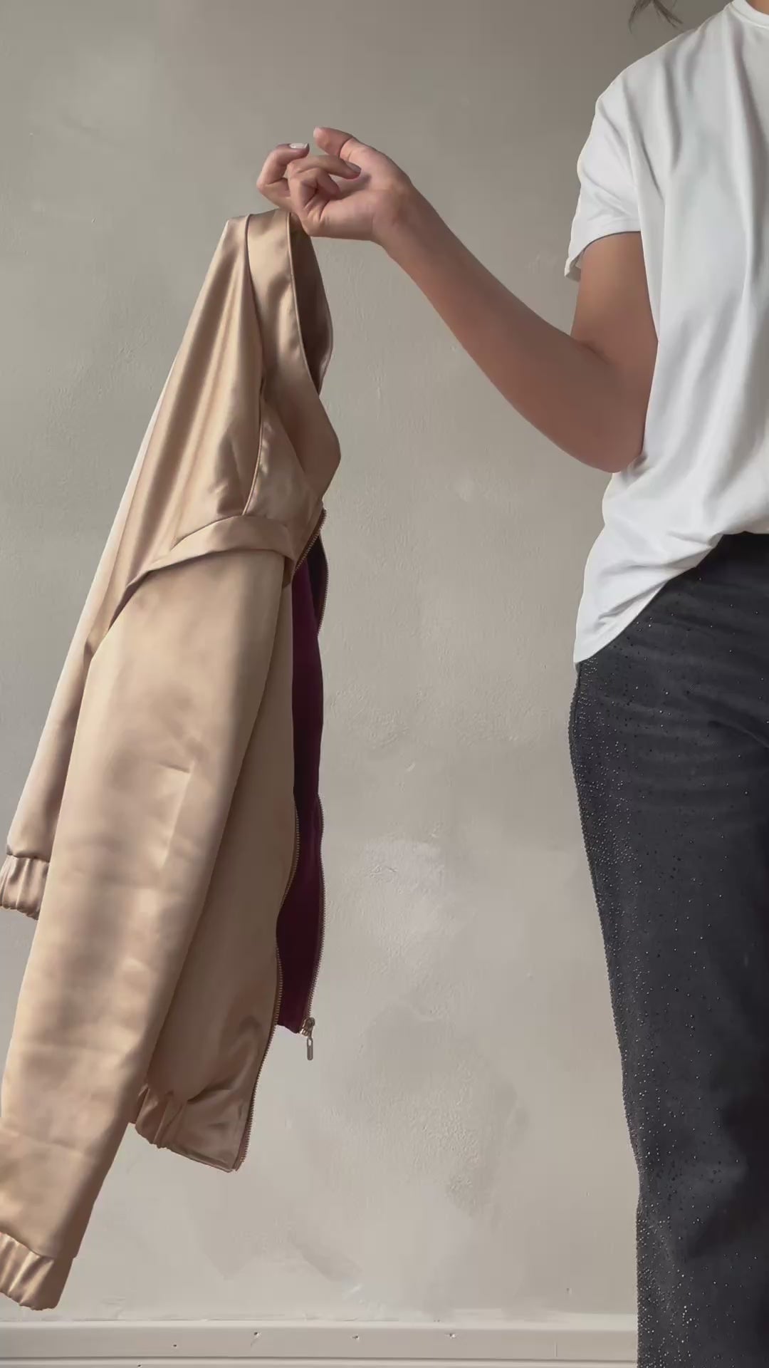 Chaqueta en Podesua calibre medio con cremallera en cobre en el centro y bolsillos laterales.