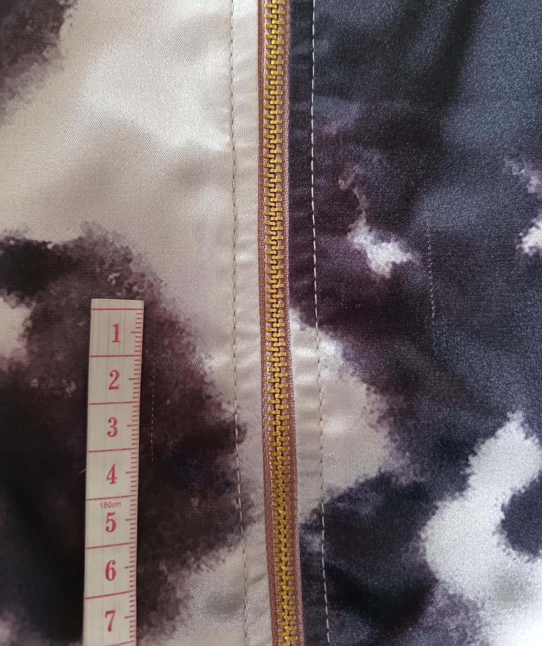 Chaqueta liviana en seda satín calibre medio estampada, con bolsillos laterales y cremallera en cobre central