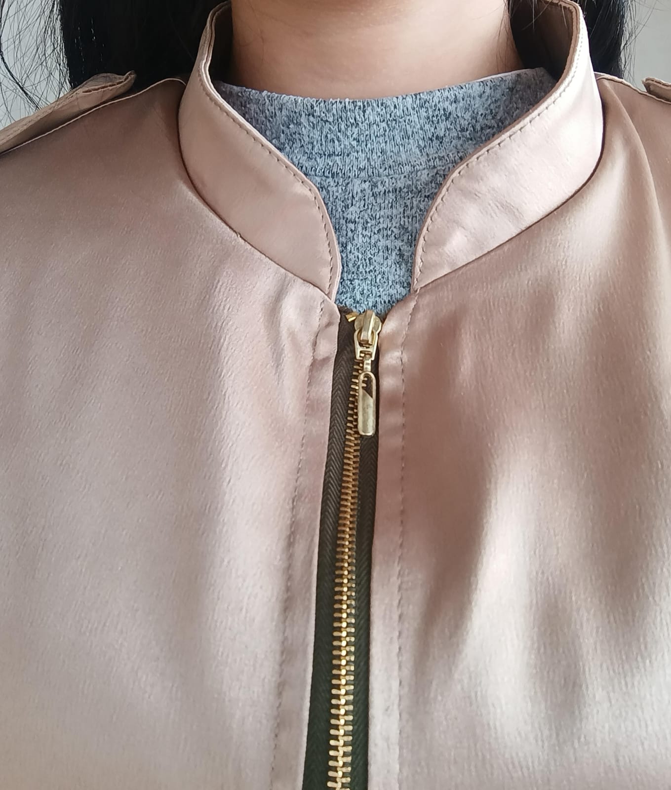 Chaqueta liviana en tela podesua color dorado, con cremallera en cobre y bolsillos laterales y forro vinotinto.