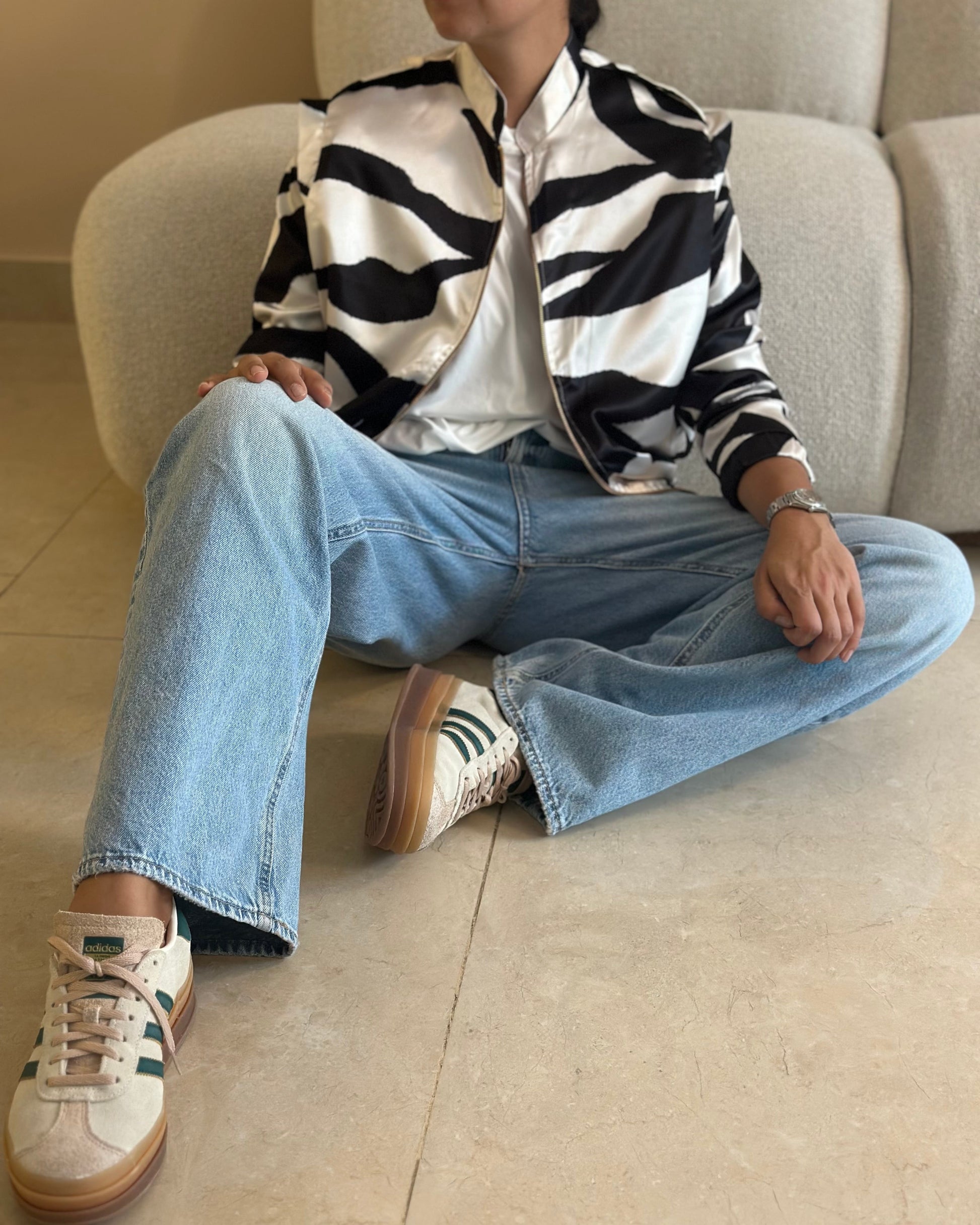 Chaqueta liviana en seda satín calibre medio estampada, con bolsillos laterales y cremallera en cobre central